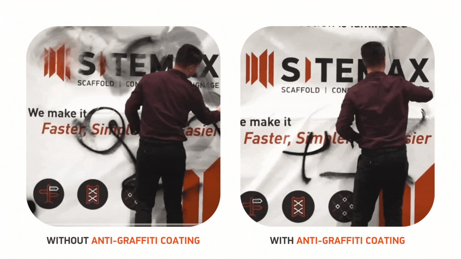 At Sitemax, our anti-graffiti coating is UV Stabilised to provide the best possible protection against the elements. It creates an easy-to-clean and highly durable surface that can protect vinyl from minor scuffs and scratches, enhancing the longevity or lifespan of the hoarding. For these reasons, anti-graffiti coatings are recognised as a cost-effective and viable for solution for protecting vinyl hoardings from vandalism and graffiti.